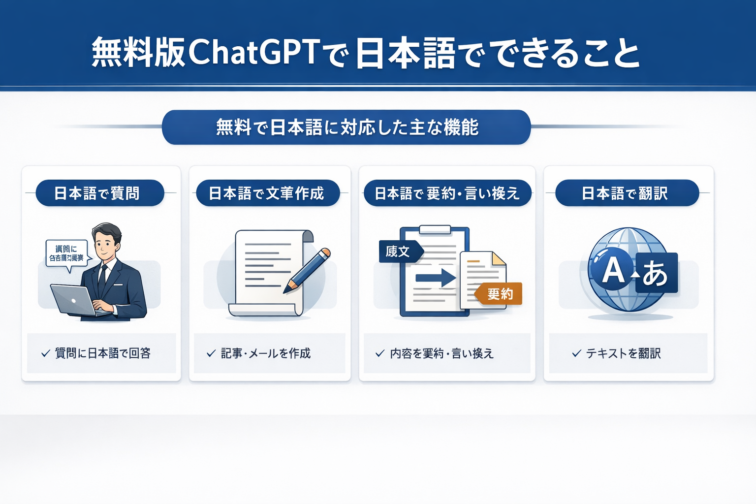 無料版ChatGPTは、文章の要約や翻訳、言い換えにも対応しています。
